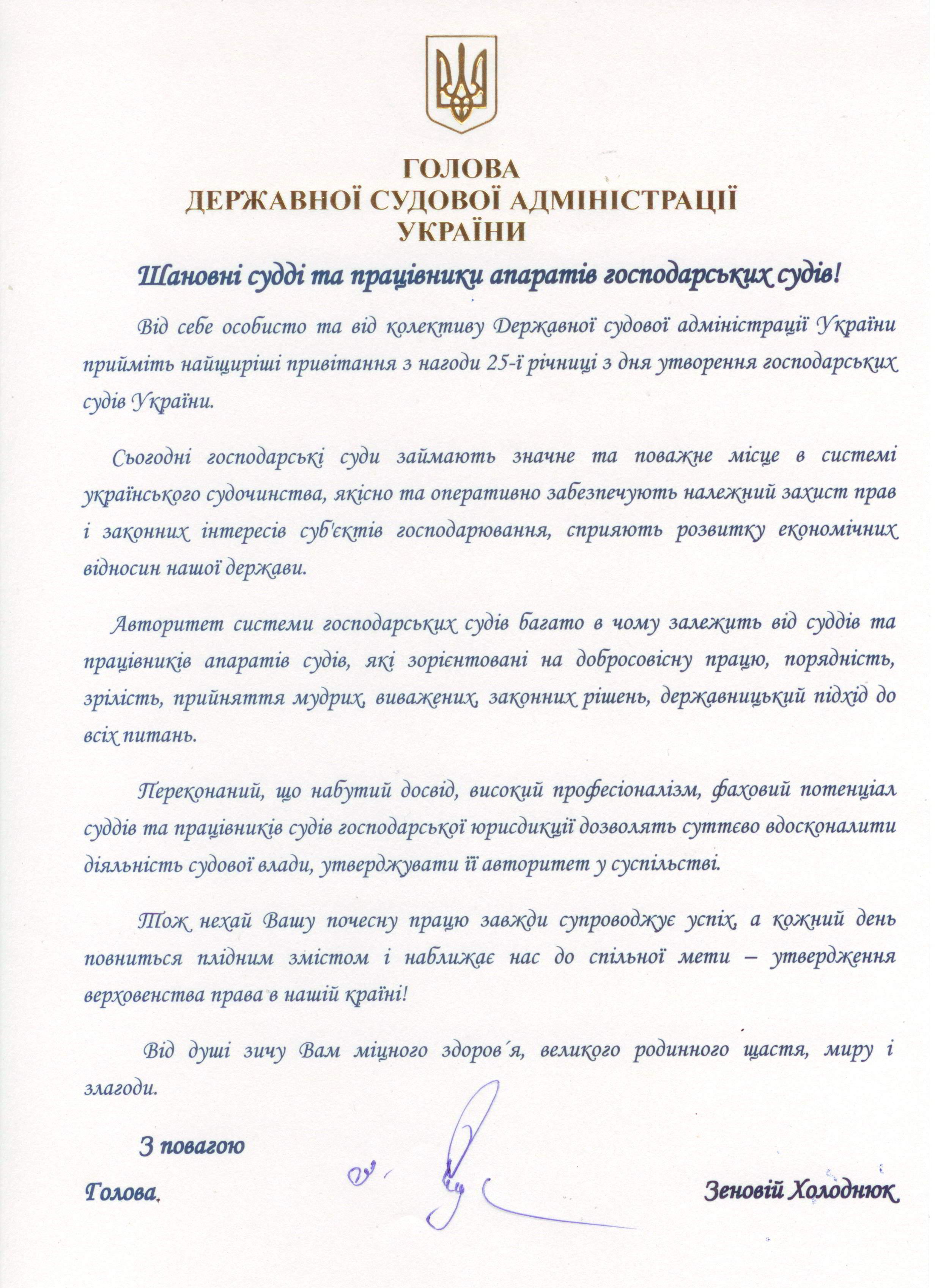 Привітання Голови Державної судової адміністрації України з нагоди 25-ї річниці створення господарських судів