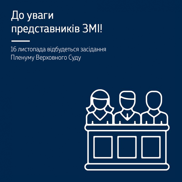16 листопада 2018 року о 14:00 у приміщенні Верховного Суду за адресою вул. П. Орлика, 8 (Кловський палац) розпочнеться засідання Пленуму Верховного Суду.